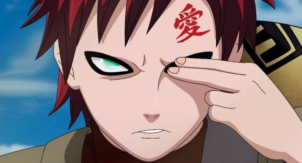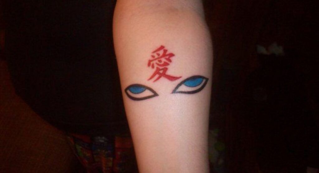 Gaara’s tattoo is the kanji for “love” (愛), symbolizing self-love born from loneliness and emotional pain.